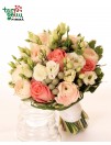 Švelni nuotakos puokštė su rožėmis, vėdrynais ir eustomomis.