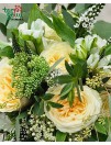 Lengva, puri ir vešli nuotakos puokštė iš rožių, frezijų, veronikos su gausia žaluma.