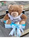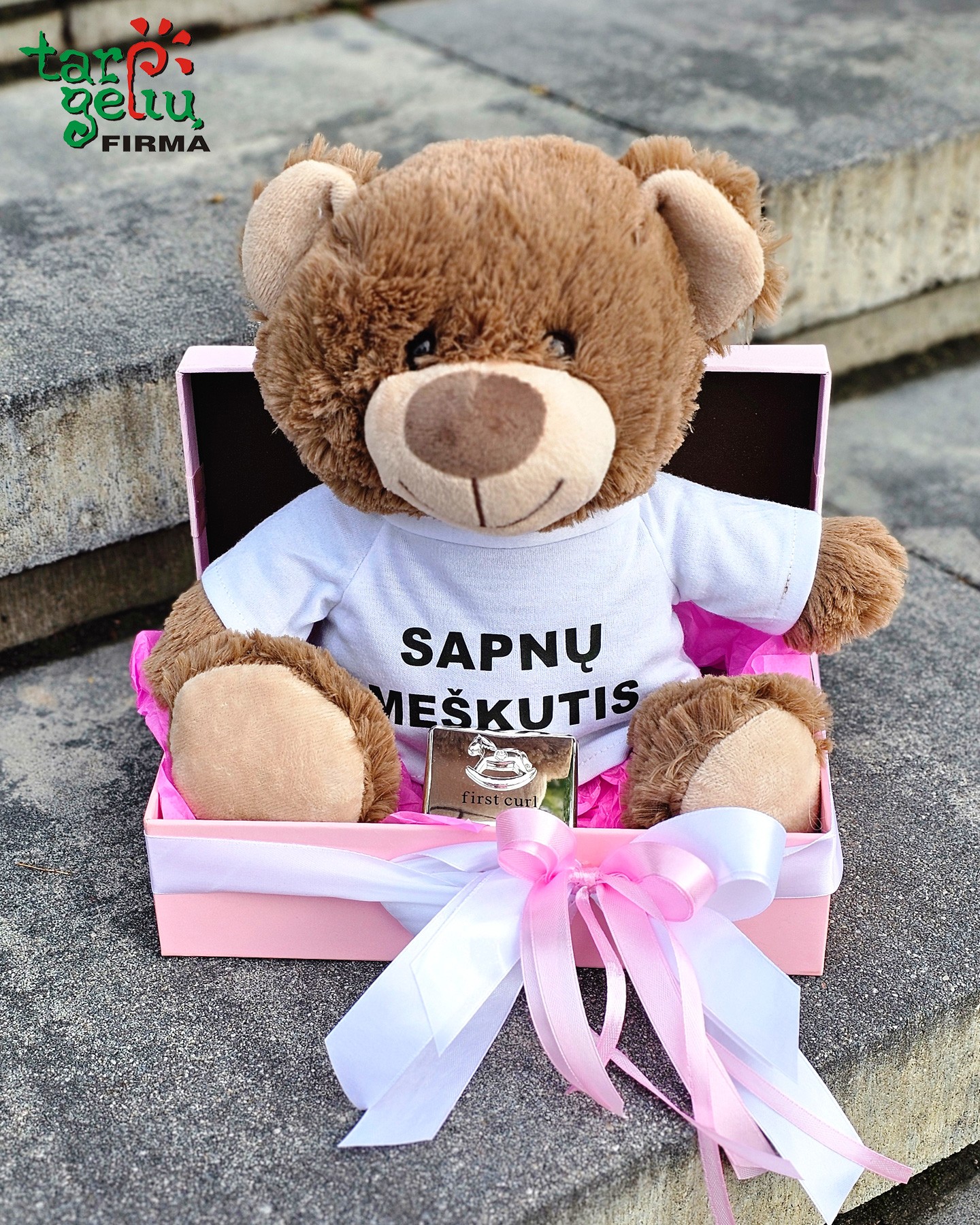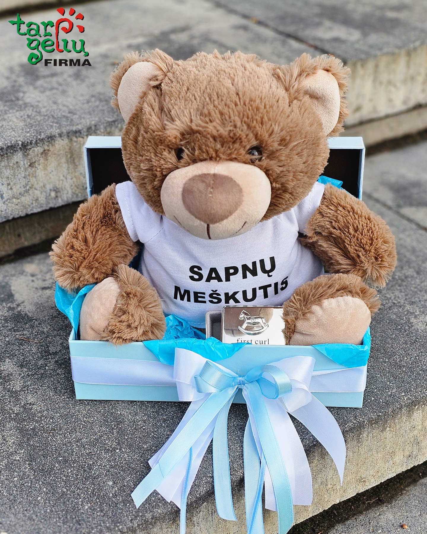 Puikus dovanų rinkinys mažyliui krikštynų ar vaiko gimimo dienos proga: pliušinis meškutis dėvintis marškinėlius su užrašu "Sapnų meškutis" ir metalinė dėžutė pirmajai plaukų sruogelei.