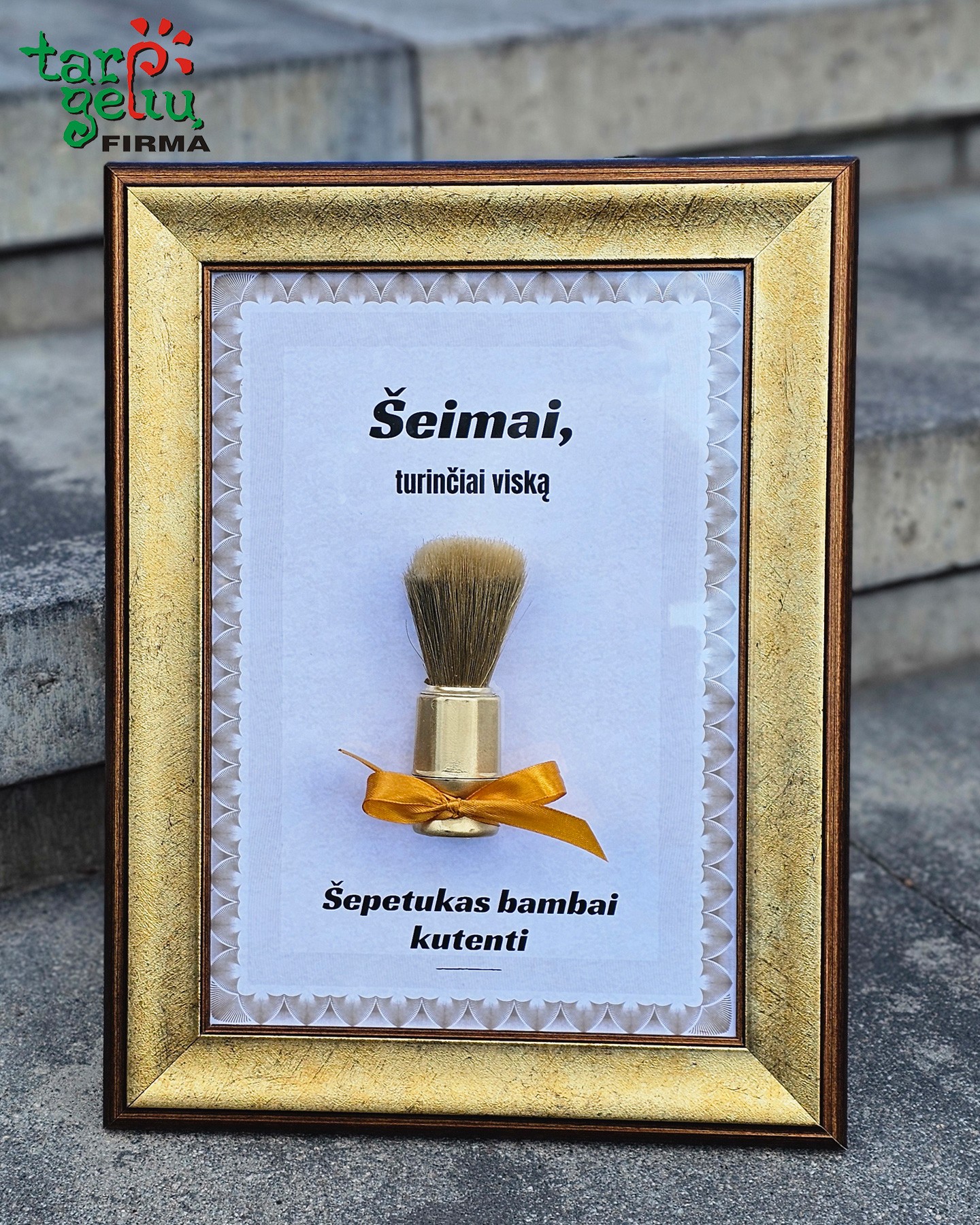 Įrėmintas šepetėlis rėmelyje su užrašu "Šeimai, turinčiai viską, šepetėlis bambai kutenti". Rėmelio matmenys: 37 x 28 cm.