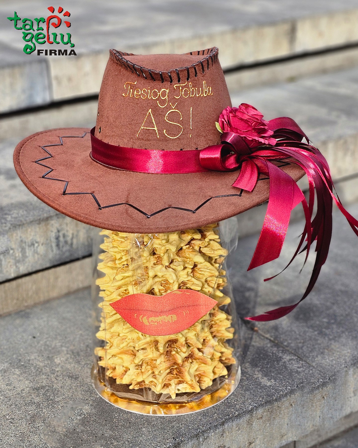 Skrybelė su užrašu ir šakotis (šakotas tuščiaviduris konditerijos kepinys, aukštis apie 38 cm). Skrybelės spalva - įvairi.