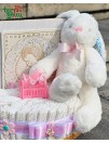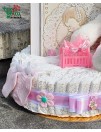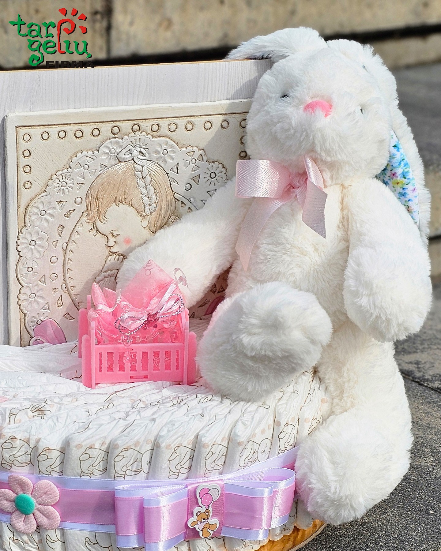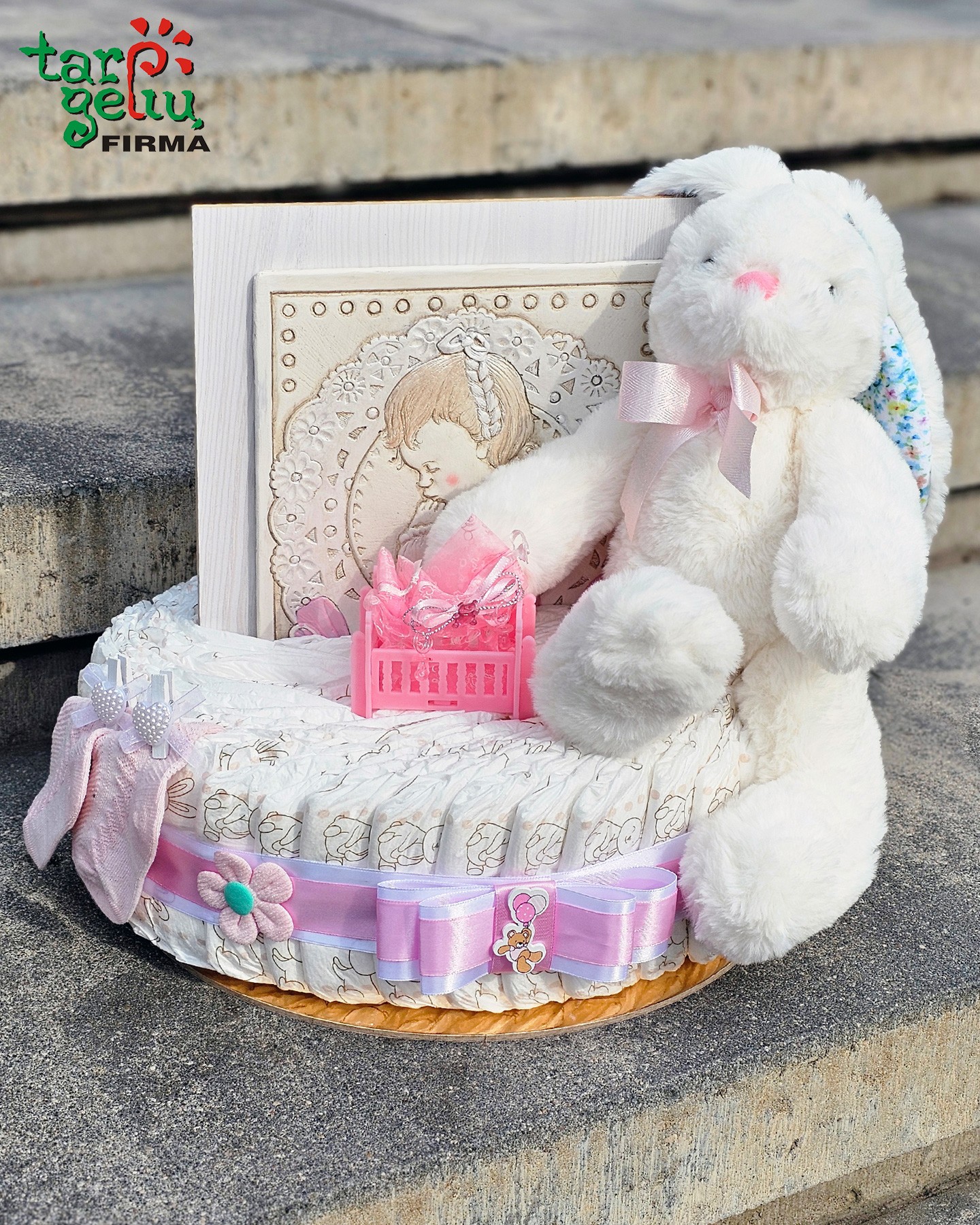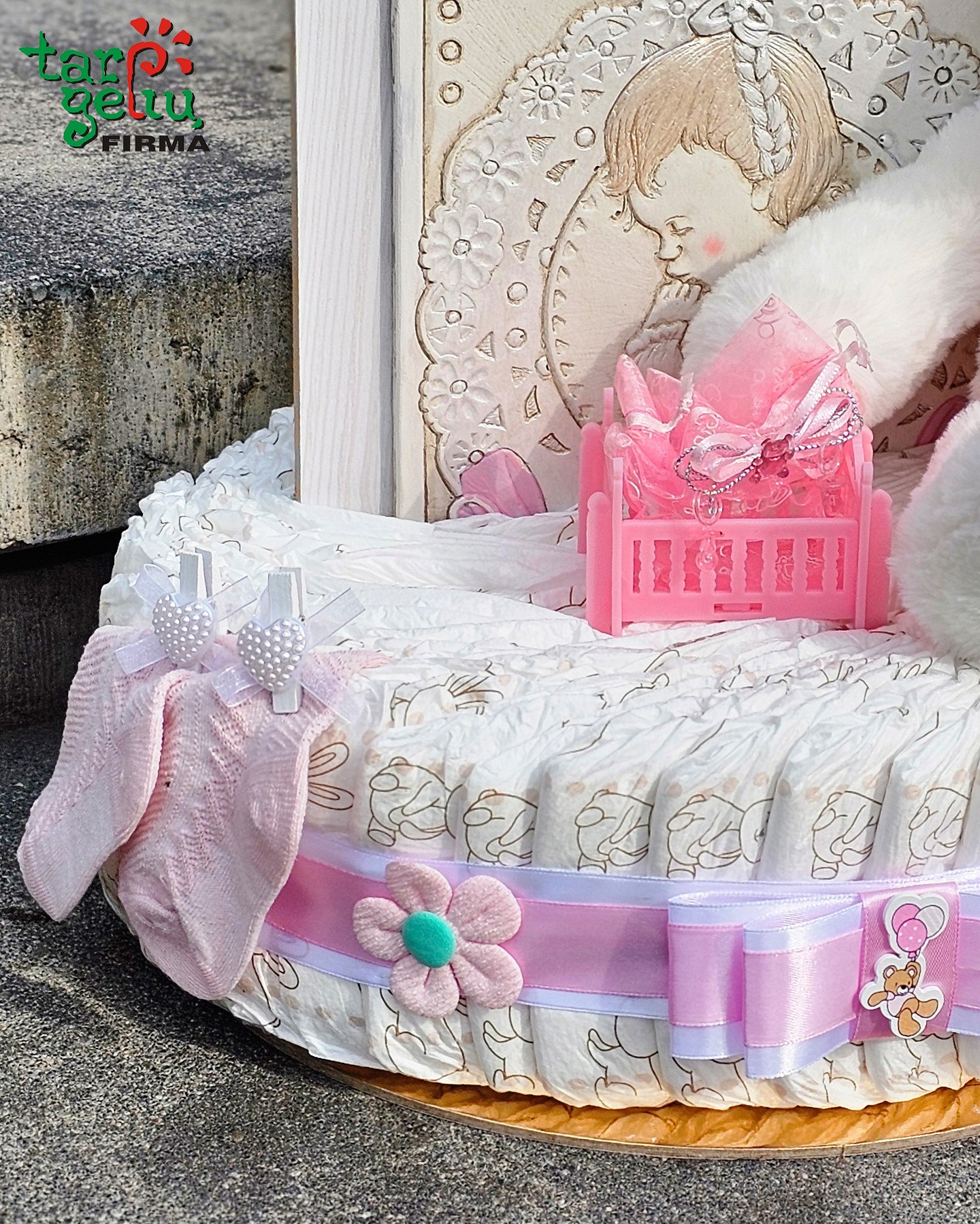 Švelnumo kupina dovana mažyliui. Rankų darbo sauskelnių tortas, papuoštas rožiniais akcentais, žaismingu zuikučiu, mielomis kojinytėmis ir ypatingu paveiksliuku. Tai ne tik praktiška, bet ir išskirtinė staigmena naujagimio šventei ar krikštynoms.
