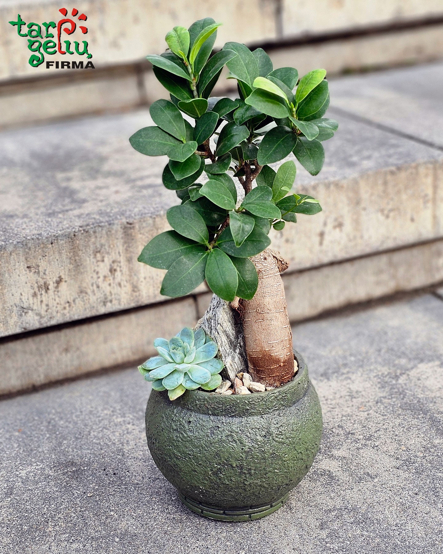 Stambesnio reljefo žalias vazonas, kontrastingas bonsai kamienas ir sukulentas – ši kompozicija skirta tiems, kurie mėgsta išskirtinumą. Tarsi nedidelė skulptūra iš gamtos. Tobula dovanai – solidi, bet neįpareigojanti.