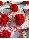 Mašinos puošimas vestuvėms. Mažina papuošta gyvais raudonais gvazdikų žiedais ir ratanu.