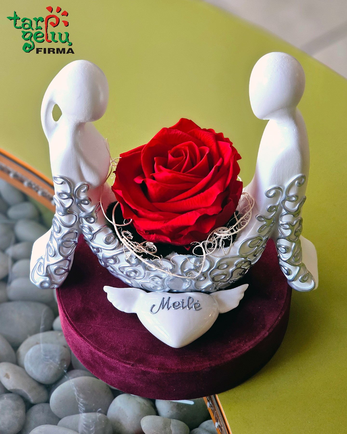 Jautri ir simbolinė kompozicija su stabilizuota raudona rože, įrėminta dviejų elegantiškų žmogaus figūrėlių. Ši kompozicija perteikia žinutę, kad meilė gyvena ten, kur yra šiluma, rūpestis ir artumas.