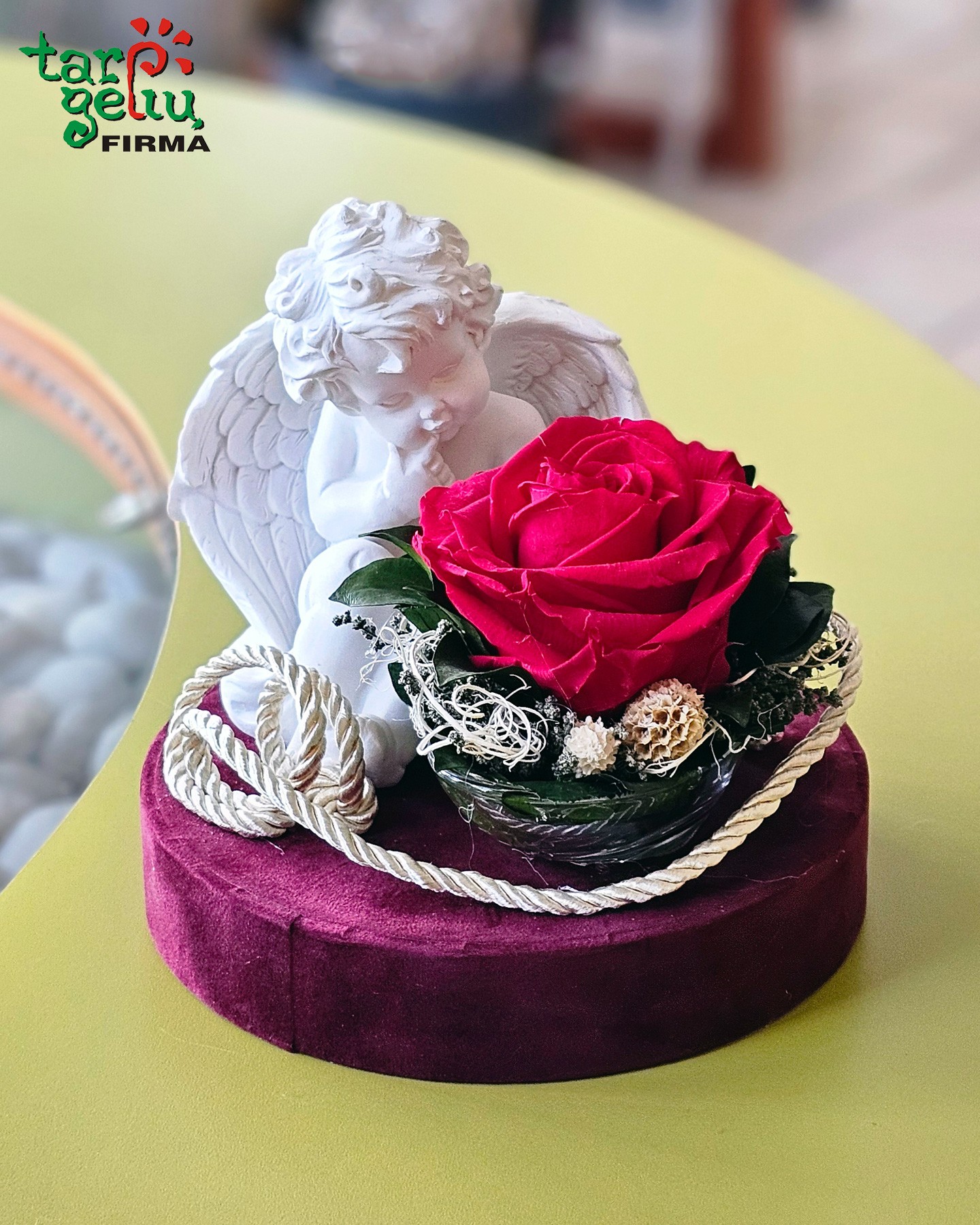 Išskirtinė dekoracija su angelo statulėle ir stabilizuotu raudonos rožės žiedu. "MIeganti" rožė išlaiko savo grožį daugelį metų be jokios priežiūros. Puikiai tinka kaip dovana mylimam žmogui, ypatingai progai ar interjero puošmena, simbolizuojanti meilę, globą ir amžinumą.