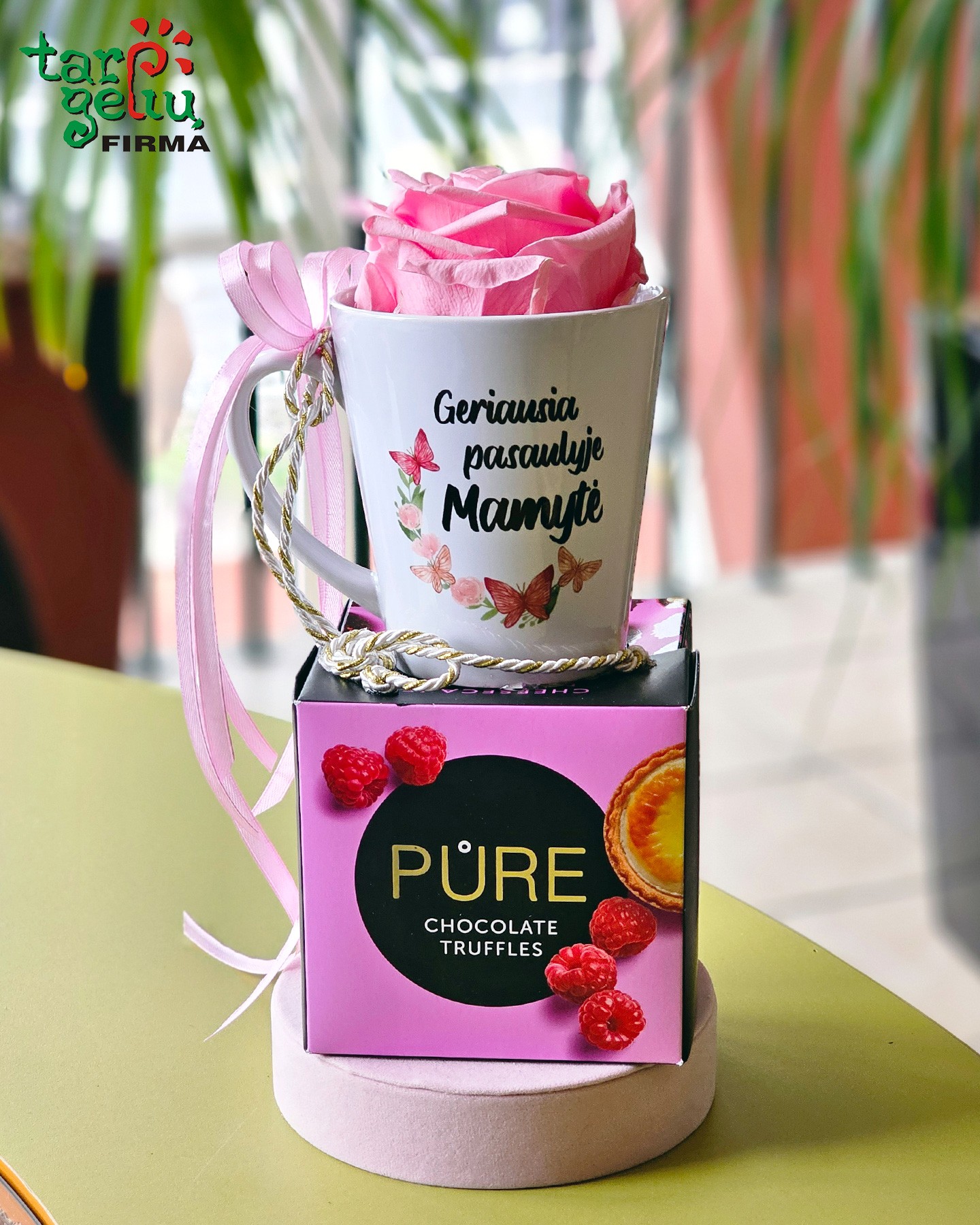 Dovanų rinkinys „Geriausia pasaulyje Mamytė“ – puodelis su rože ir šokoladiniais triufeliais. Puikus pasirinkimas Motinos dienai, gimtadieniui ar tiesiog norint pradžiuginti Mamą jaukia ir saldžia staigmena.