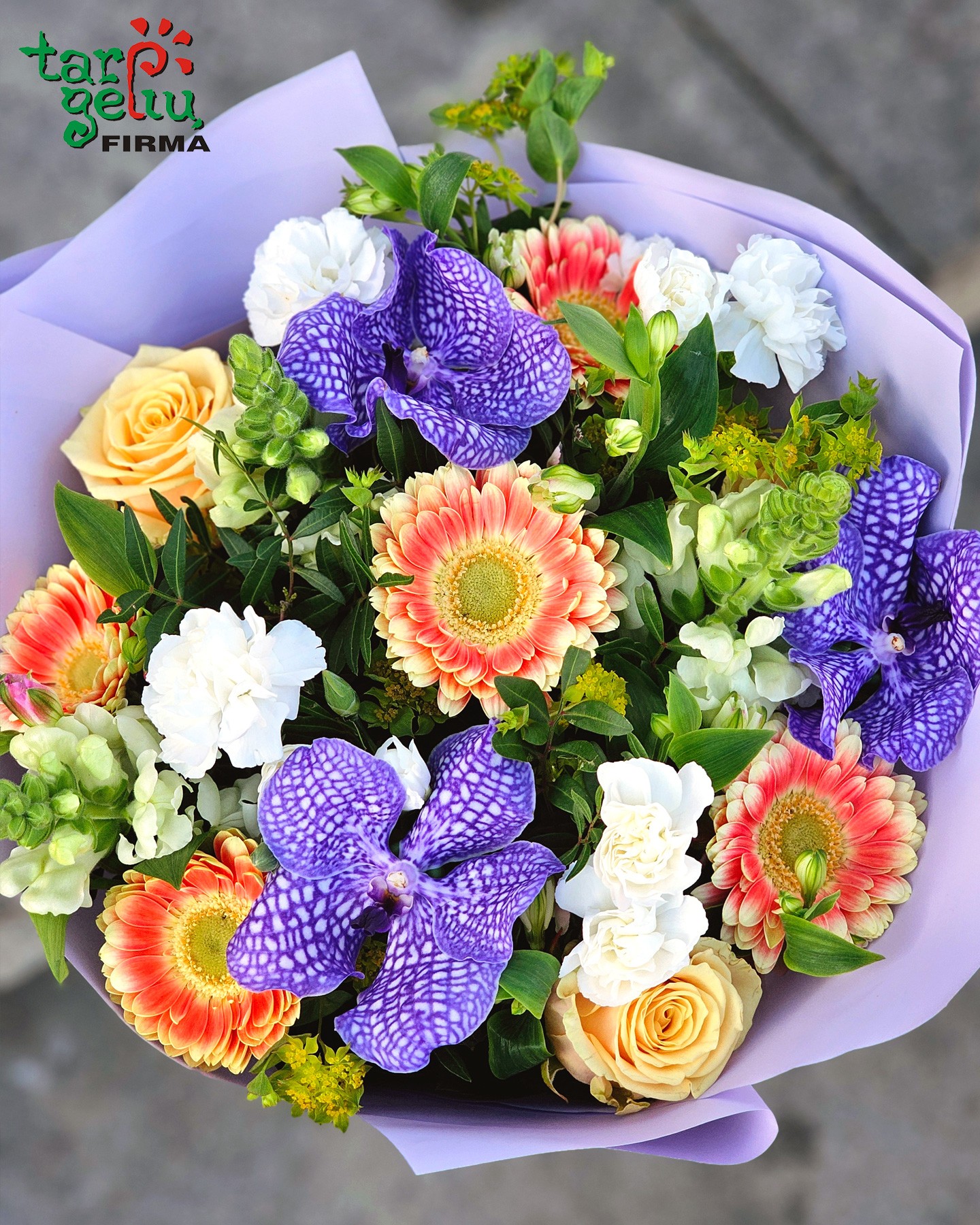 Subtili ir harmoningai suderinta puokštė, kurioje dera violetinės orchidėjos, švelnios gerberos, kreminės rožės ir gaivūs žalumos akcentai. Puikiai tinks nuoširdžiai padėkai – kolegoms, mokytojams ar artimiesiems.