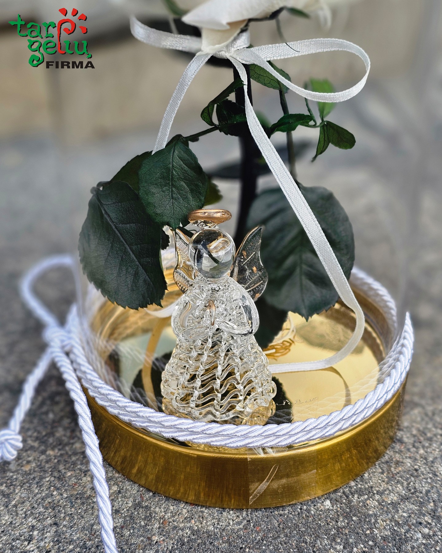 Niekas kitas taip neatspindi iki dangaus pakylėjančio ramybės jausmo, kaip balta spalva ir stiklo skaidrumas. Dovanokite širdies ramybę, įkūnytą romantiškame ilgai nevystančio gėlės žiedo ir stiklo angeliuko duete.