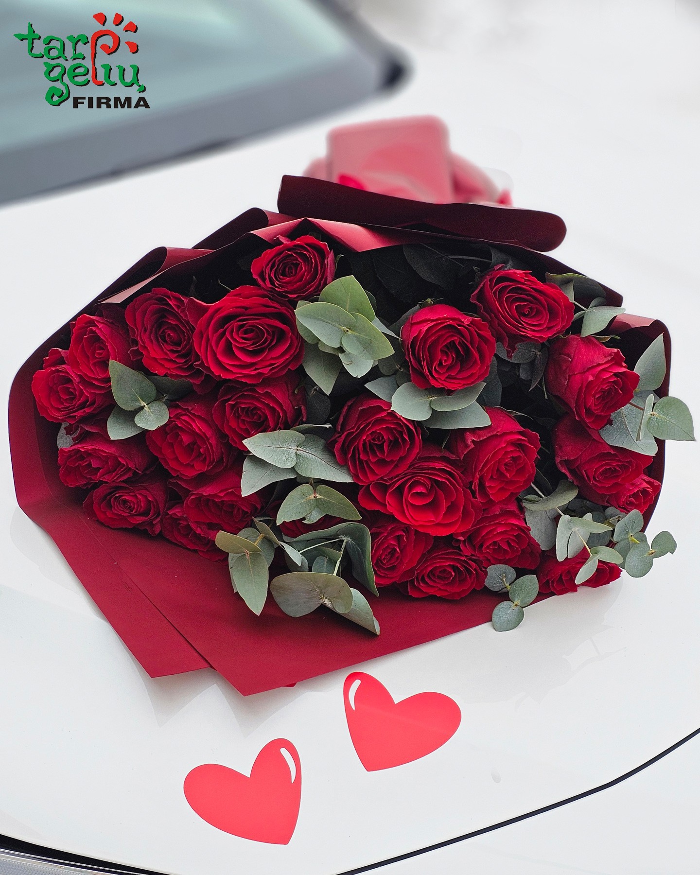 Laiko patikrinta klasika – sodriai raudonos rožės, subtiliai papildytos žaluma. Puokštė spinduliuoja prabanga ir jausmus be žodžių. Tinka dovanoti bet kokia proga, kai norisi padaryti įspūdį.