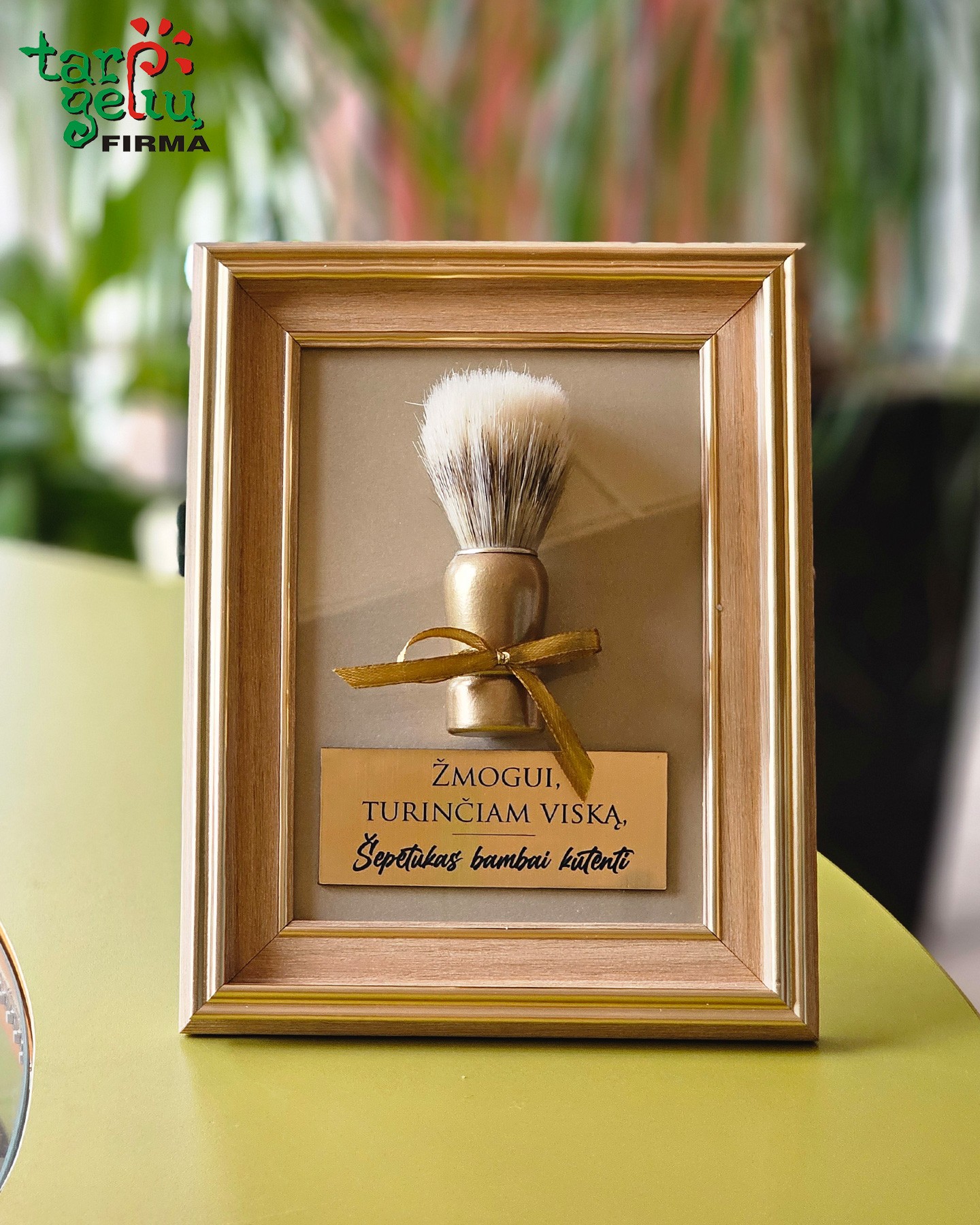 Originali ir išskirtinė dovana vyrui, kuris, atrodo, jau viską turi. Šis dekoratyvinis rėmelis su subtiliai įkomponuotu skutimosi šepetėliu ne tik papuoš interjerą, bet ir suteiks šypseną kiekvieną kartą į jį pažvelgus.