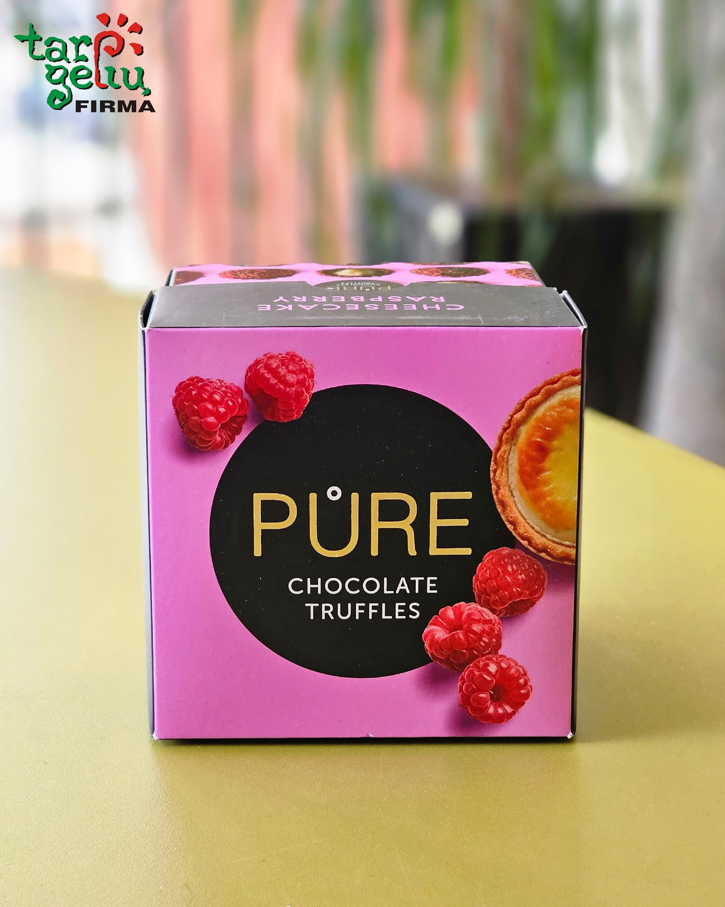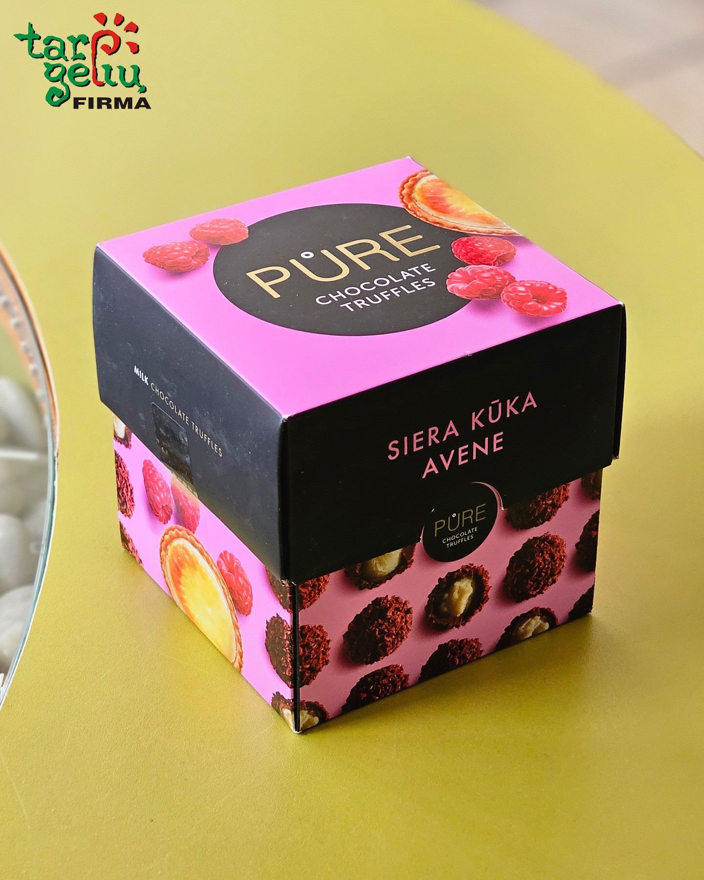 Pieniško šokolado triufeliai su sūrio pyrago skonio kremo įdaru ir aviečių papuošimu– dangiško skonio saldumynas. Pradžiuginkite Jums svarbų žmogų, padovanodami jam saldų malonumą.