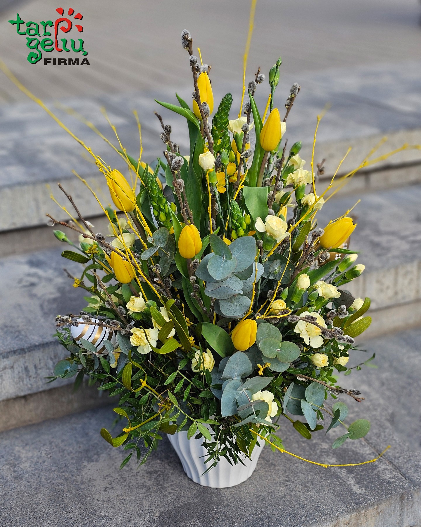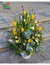 Šviesi pavasarinė gėlių kompozicija - puikiai nuotaiką skleidžianti dovana šv.Velykų proga.