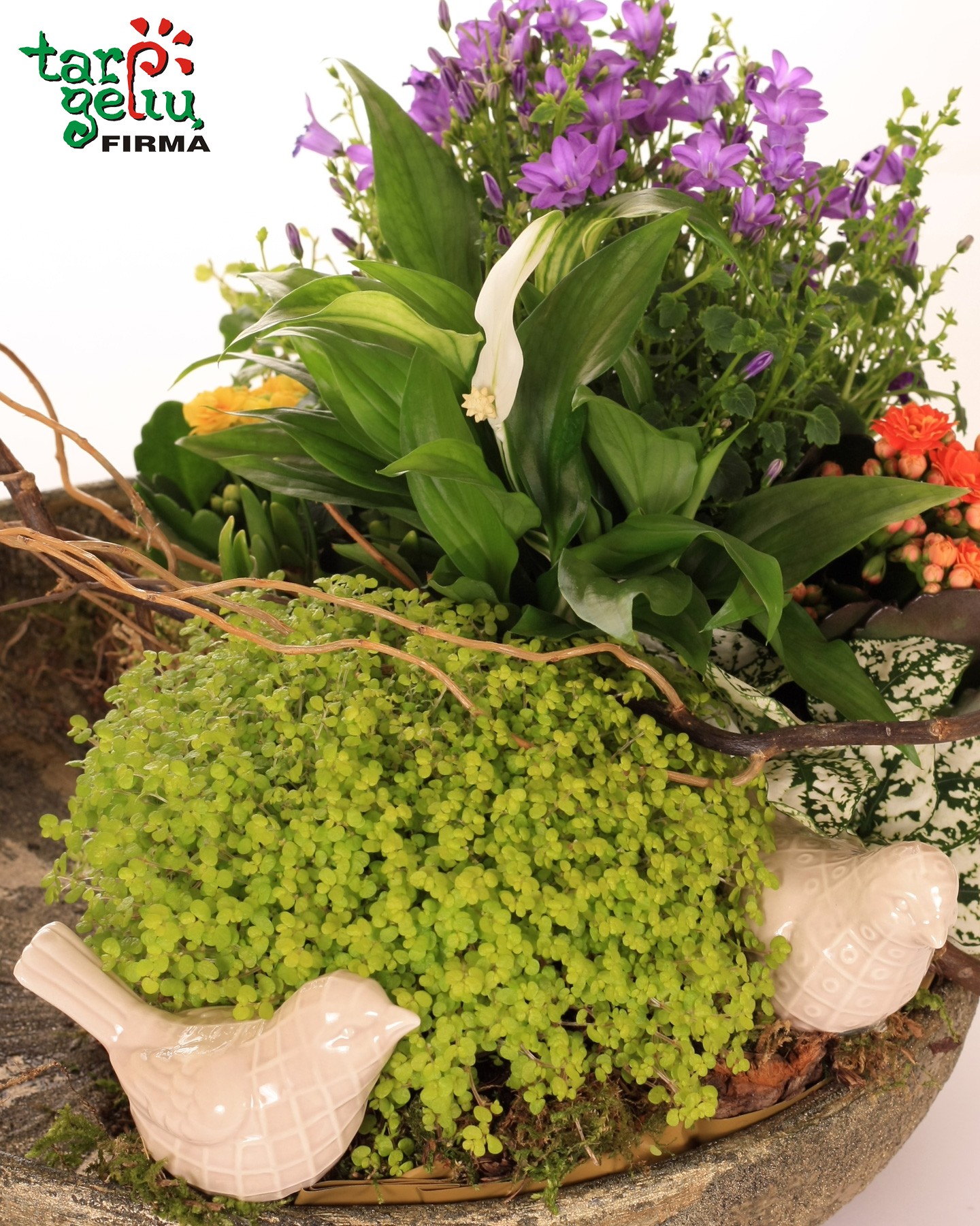 Įvairios vazoninės gėlės, keramikinis padėklas, dekoravimo elementai.