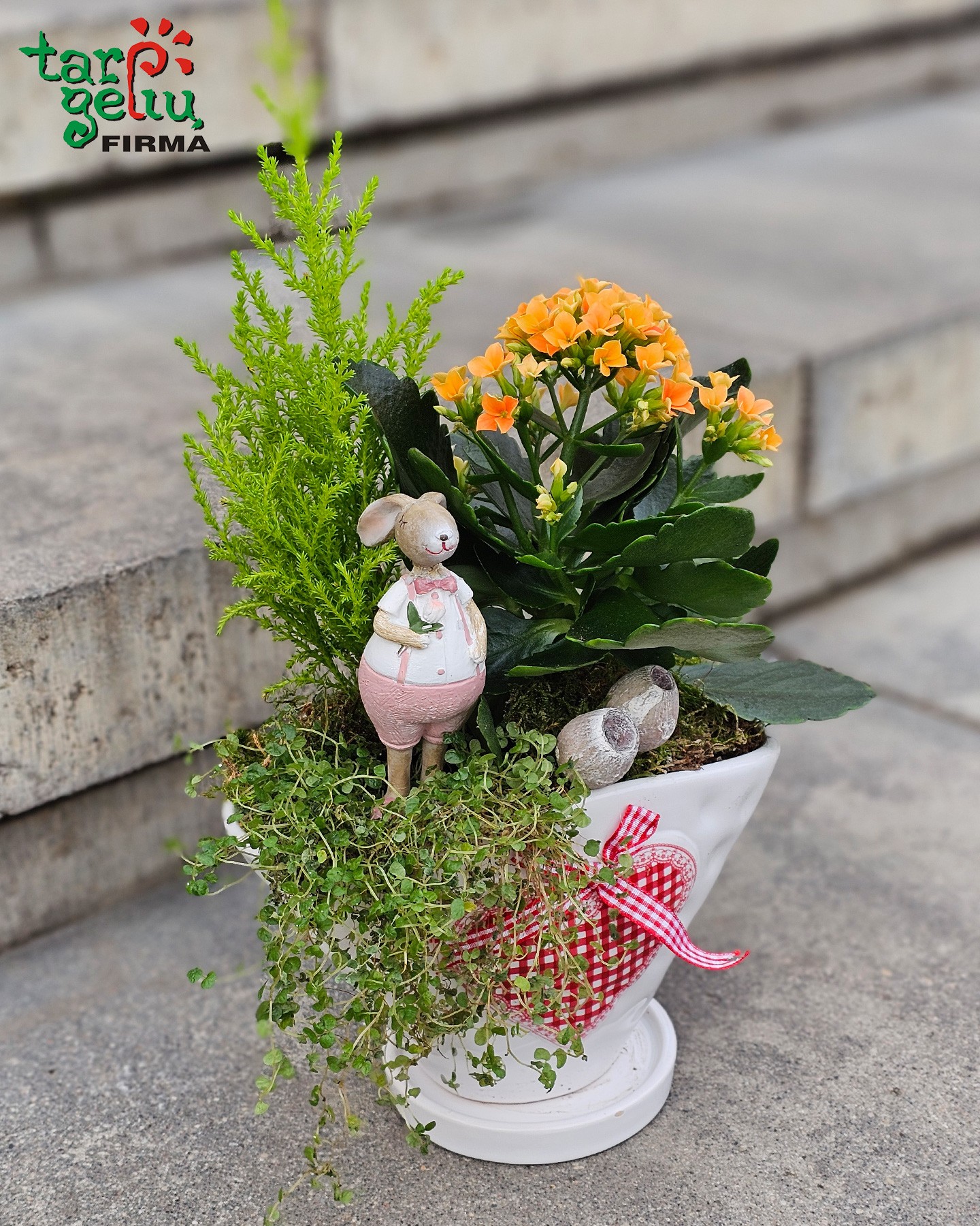 Žaisminga augalų kompozicija gražiai pavasario šventei.